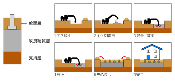 ~施工方法~軟弱地盤にセメント系固化材を混ぜ、転圧し、水和性硬化反応を利用して地盤の安定処理を行います。