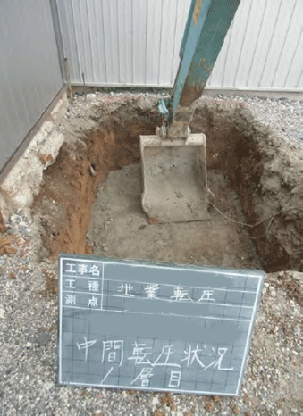 地盤調査の結果、一部分だけ他と比べて地盤が緩かった場合に行われます。緩かったその部分だけを掘り起し、地面を締める固化材と一緒に埋戻し入念に転圧をします。 他の改良工事と比べ工期が短く、何より土地の価値を下げずに済みます。 |
