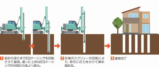 ~EGケーシングとは~砕石を用いる地盤改良技術では、軟弱地盤や地下水の多い砂地盤などを掘削すると、穴の壁面が崩れやすく、設計(深さ、直径、砕石量)どおりに砕石を詰め込むことが困難でした。 この課題を抜本的に解決したのが、新開発の「EGケーシング」です。従来、住宅の砕石地盤改良工法において「ケーシング」(鉄の筒)を使うことは不可能とされてきましたが、エコジオが世界で初めて実用化に成功。このEGケーシングにより、穴の壁面の崩壊を確実に防ぎます。