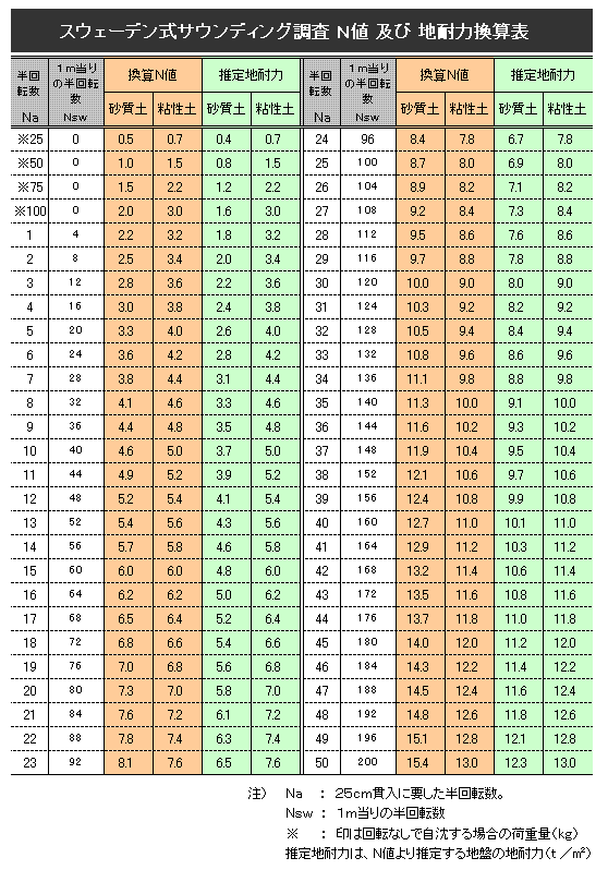 | ただし、建築基準法ではこの式を使うに当たっては、基本的に基礎の下から2mの間にNswが0の層が存在しない事、2~5mの間に Wswが500N(0.50kN)以下の層が存在しない事となっています。 下記地耐力の数値はt/㎡で記載していますので、告示との対比ではSI単位(国際単位)に換算して対比してください。 |